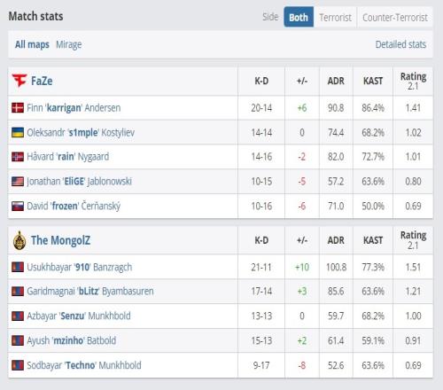图一是Mongolz选图的Mirage,上半场Faze拿下手枪局之后4-1的开局,但是被Mongolz一波沙鹰eco翻盘成功!上半场Faze只有35岁的Karrigan孤军奋战,双方6-6之后Mongolz拿下下半场手枪局之后连续拿到6分,直接拿下局点!frozen和Elige持续隐身,s1mple大狙醒了过来连续扛住局势帮助队伍追分,但是最后一局中路贴脸连空两枪被前顶的910成功双杀!Mongolz一波0换4没有再给机会!最终Mongolz以13-9拿下自己的选图!